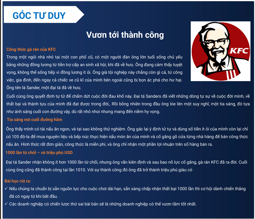 - Nếu chúng ta chuẩn bị sẵn nguồn lực cho cuộc chơi dài hạn, sẵn sàng chấp nhận thất bại 1000 lần thì cơ hội dành chiến thắng đã có ngay từ khi bắt đầu.
