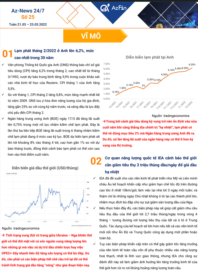 • Văn phòng Thống kê Quốc gia Anh (ONS) thông báo chỉ số giá tiêu dùng (CPI) tăng 6,2% trong tháng 2, cao nhất kể từ tháng 3/1992, vượt dự báo trung bình tăng 5,9% trong cuộc khảo sát các nhà kinh tế học của Reuters. CPI tháng 1 của Anh tăng 5,5%.