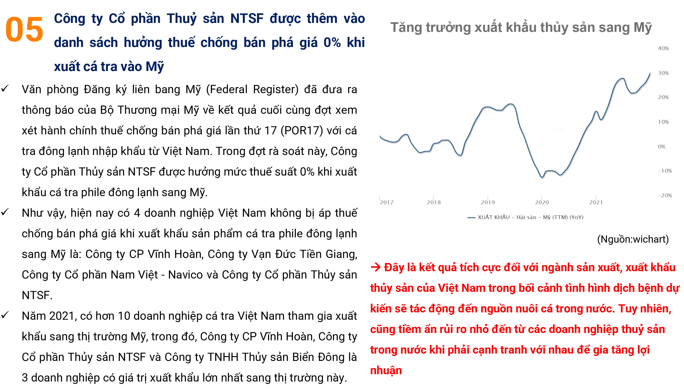 • Văn phòng Đăng ký liên bang Mỹ (Federal Register) đã đưa ra thông báo của Bộ Thương mại Mỹ về kết quả cuối cùng đợt xem xét hành chính thuế chống bán phá giá lần thứ 17 (POR17) với cá tra đông lạnh nhập khẩu từ Việt Nam. Trong đợt rà soát này, Công ty Cổ phần Thủy sản NTSF được hưởng mức thuế suất 0% khi xuất khẩu cá tra phile đông lạnh sang Mỹ.
