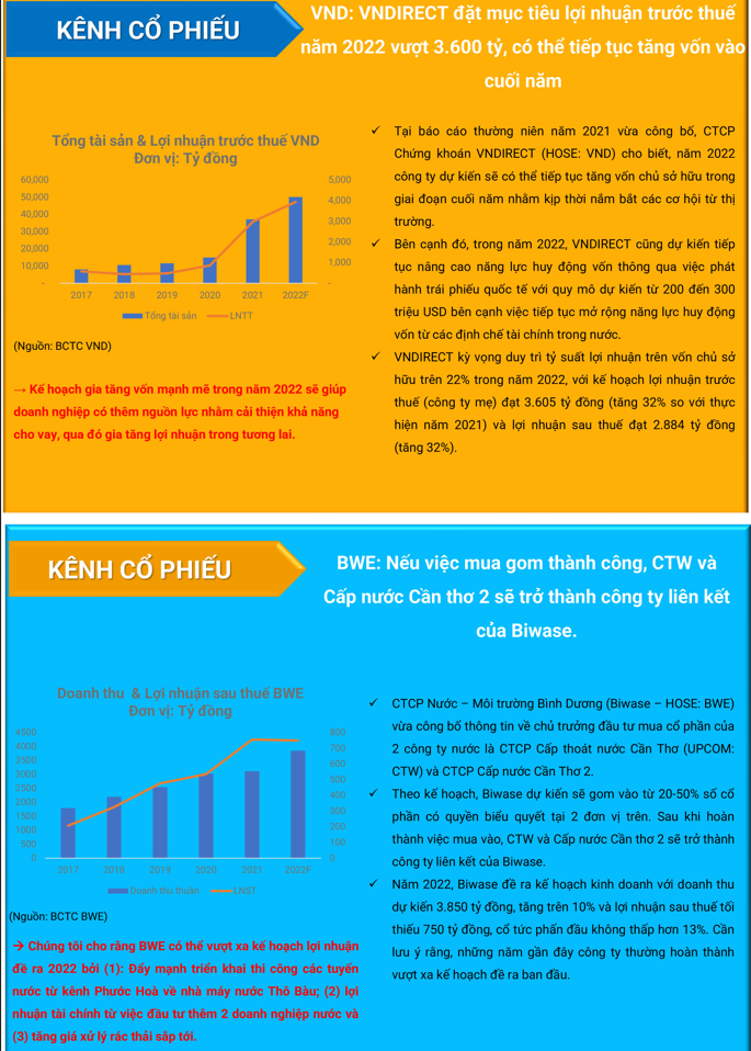 • VNDIRECT kỳ vọng duy trì tỷ suất lợi nhuận trên vốn chủ sở hữu trên 22% trong năm 2022, với kế hoạch lợi nhuận trước thuế (công ty mẹ) đạt 3.605 tỷ đồng (tăng 32% so với thực hiện năm 2021) và lợi nhuận sau thuế đạt 2.884 tỷ đồng (tăng 32%).