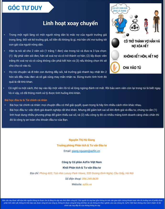 • Bài học đầu tư: việc định giá doanh nghiệp rất khó khăn. Nhưng để giảm bớt sai số khi định giá và đầu tư, chúng ta cần (1) linh hoạt dung nhiều phương pháp để giảm thiểu sai số, và (2) nếu công ty đó có nhiều mảng kinh doanh càng chắc chắn thì đó là công ty an toàn cho khoản đầu tư của Bạn.