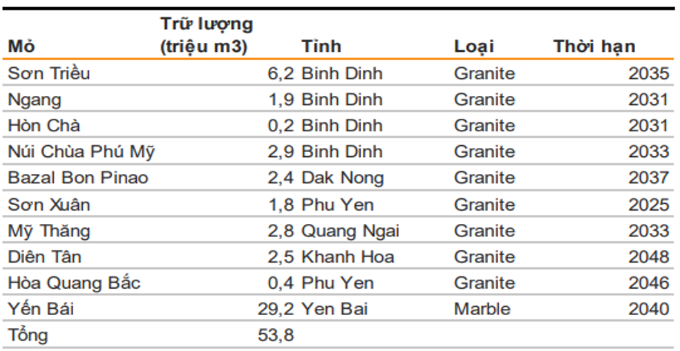 Về trữ lượng đá, Phú Tài đang sở hữu các mỏ đá với trữ lượng gần 54 triệu m3, cùng thời hạn khai thác trung bình lên tới trên 20 năm và còn khá dài khi so sánh với các doanh nghiệp ngành đá niêm yết khác.