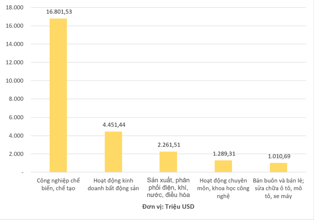 Xét theo lĩnh vực đầu tư, các nhà đầu tư nước ngoài đã đầu tư vào 19 ngành trong tổng số 21 ngành kinh tế quốc dân. Trong đó, ngành công nghiệp chế biến, chế tạo dẫn đầu với tổng vốn đầu tư đạt hơn 16,8 tỷ USD, chiếm 60,6% tổng vốn đầu tư đăng ký. Ngành kinh doanh bất động sản đứng thứ hai với tổng vốn đầu tư hơn 4,45 tỷ USD, chiếm 16,1% tổng vốn đầu tư đăng ký. Tiếp theo lần lượt là các ngành sản xuất, phân phối điện; hoạt động chuyên môn khoa học công nghệ với vốn đăng ký đạt lần lượt hơn 2,26 tỷ USD và gần 1,29 tỷ USD. Còn lại là các ngành khác.
