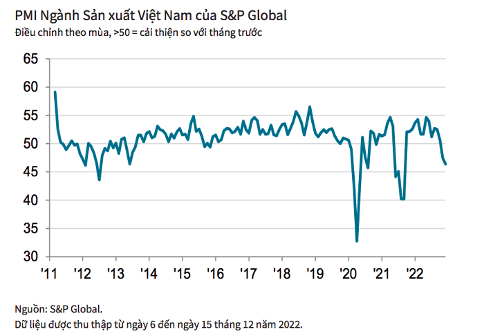 Theo báo cáo từ IHS Markit, trong tháng cuối của năm 2022, ngành sản xuất Việt Nam suy giảm mạnh hơn khi nhu cầu cả ở trong nước và nước ngoài đều giảm. Trước tình hình đó, các công ty đã giảm việc làm và hoạt động mua hàng, trong khi niềm tin kinh doanh vẫn ở mức thấp.