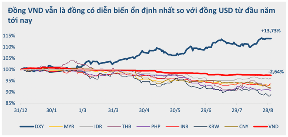 Các đánh giá áp lực mất giá hiện tại của đồng VND chủ yếu do đồng USD lên giá, trong khi Việt Nam vẫn duy trì được kinh tế vĩ mô ổn định, lạm phát thấp, lãi suất thực còn dương và thặng dư thương mại (BVSC). Với sức mạnh nội tại cùng các biện pháp điều hành linh hoạt của Ngân hàng nhà nước (NHNN), đồng VND sẽ không mất giá quá 3% trong năm 2022.