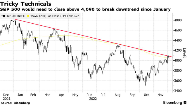 Tuần trước, Chủ tịch Fed Jerome Powell đã tạo ra sự lạc quan khi cho biết Ngân hàng trung ương sẽ làm chậm tốc độ tăng lãi suất ngày từ cuộc họp chính sách sắp tới. Những nhận định của ông Powell đã khiến S&P 500 tăng 3,1% và chính thức vượt qua mức trung bình động 200 ngày – một chỉ báo kỹ thuật được theo dõi rộng rãi nhằm đánh giá xu hướng dài hạn. Đây là lần đầu tiên S&P 500 vượt ngưỡng này kể từ tháng 4. Kết thúc tuần qua, S&P 500 tăng 1,1% khi các nhà đầu tư đánh giá báo cáo việc làm mạnh một cách đáng kinh ngạc và những rủi ro bao trùm từ việc FED tăng lãi suất sẽ đẩy nền kinh tế Mỹ rơi vào suy thoái.