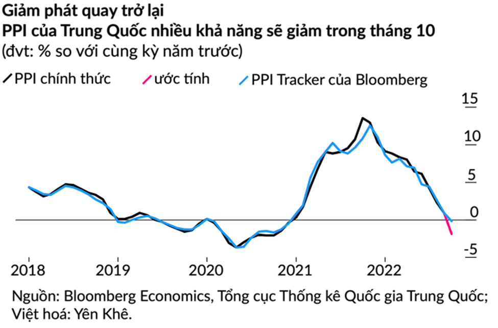 Áp lực giảm phát tại Trung Quốc đang ngày càng lớn khi COVID-19 tái bùng phát và các biện pháp kiểm soát dịch kìm hãm nhu cầu tiêu dùng của người dân. Bên cạnh đó, giá của một số hàng hoá đi xuống đang gây áp lực buộc các công ty phải hạ giá bán. Theo ước tính trung vị của các nhà kinh tế mà Bloomberg đã phỏng vấn, chỉ số giá sản xuất (PPI) của Trung Quốc nhiều khả năng sẽ rơi vào tình trạng giảm phát trong tháng 10, lần đầu tiên sau gần hai năm qua.
