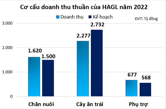 Trong năm vừa rồi, ngành chăn nuôi đem về cho HAGL 1.620 tỷ đồng, tương ứng số lượng heo thịt tiêu thụ là 292.847 con. Ngành cây ăn trái tạo ra 2.277 tỷ đồng doanh thu với sản lượng 281.275 tấn, trong đó 57% sản lượng tiêu thụ là chuối xuất khẩu, chuối dùng cho sản xuất thức ăn gia súc chiếm 43%. 677 tỷ đồng doanh thu còn lại đến từ ngành phụ trợ.