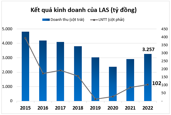 Kết quả, doanh thu bán hàng và cung cấp dịch vụ của LAS ước đạt 3.257 tỷ đồng, lợi nhuận trước thuế 102 tỷ đồng, lần lượt tăng 12% và 20% so với năm ngoái. Tính riêng quý IV, doanh thu của LAS ước khoảng 747 tỷ đồng, lợi nhuận trước thuế 17 tỷ, tương ứng giảm 15% và tăng 55% so với quý IV/2021.