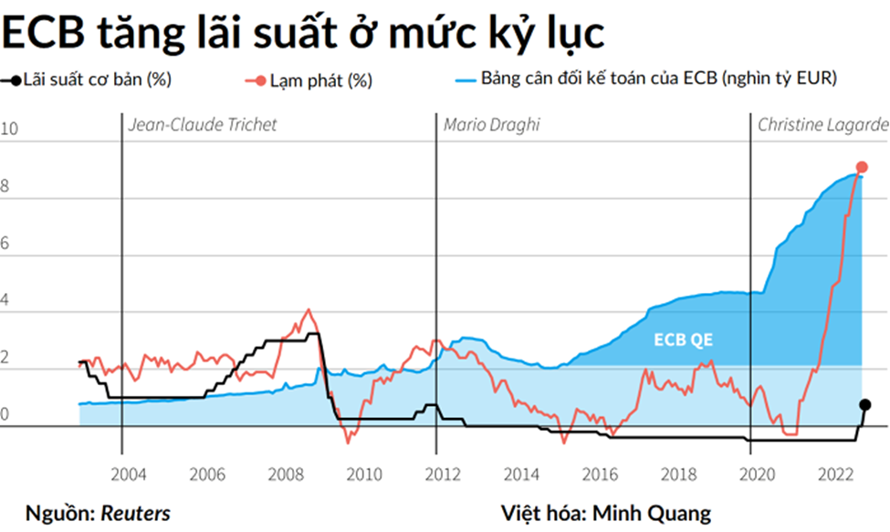 Sau đợt tăng lãi suất vào tháng 7, ECB đã nâng lãi suất huy động từ 0 lên 0,75% và nâng lãi suất tái cấp vốn chính lên 1,25%, mức cao nhất kể từ năm 2011. Những động thái tiếp theo được dự đoán sẽ diễn ra vào tháng 10 và tháng 12.