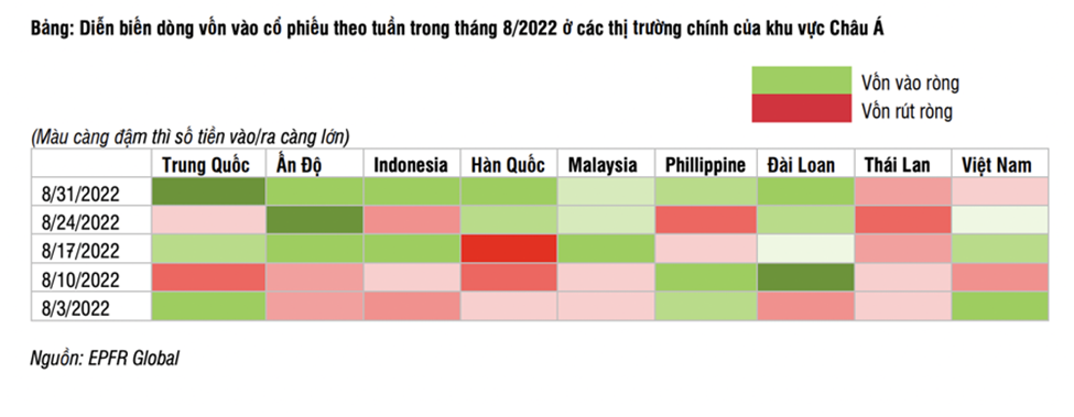 Dòng vốn vào khu vực Đông Nam Á như Indonesia (+12 triệu USD), Việt Nam (+13,9 triệu USD) hay Ấn Độ (+83,7 triệu USD) đã có chuyển biến tích cực hơn trong tháng 8.