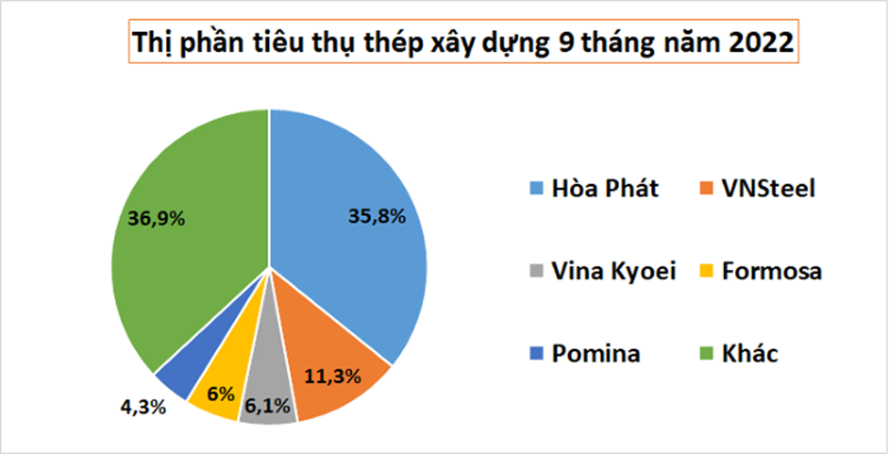 Theo số liệu của VSA, 9 tháng đầu năm, tiêu thụ thép xây dựng của Hòa Phát đạt 3,4 triệu tấn, tăng 24% so với cùng kỳ năm 2021, chiếm 38% thị phần tiêu thụ thép xây dựng, dẫn đầu toàn ngành.