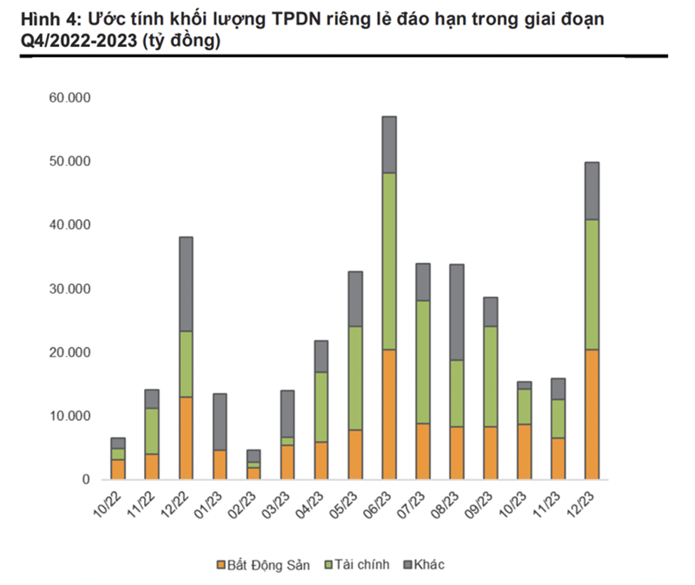 Trong quý 4, Bất động sản tiếp tục là nhóm ngành chiếm tỷ trọng lớn nhất với 34,1% tổng giá trị đáo hạn trái phiếu riếng lẻ trong quý, tương đương 20.071 tỷ đồng giảm 40,3% so với quý Q3/22, tăng 65,2% so với cùng kỳ. Các doanh nghiệp bất động sản có giá trị đáo hạn cao nhất trong Quý 4 bao gồm: Công ty CP Tập đoàn Sunshine (bao gồm các công ty con) (3.000 tỷ đồng), Công ty CP Tập đoàn Đầu tư Địa ốc Nova (3.000 tỷ đồng) và Công ty CP Bách Hưng Vương (2.980 tỷ đồng). Tài chính – Ngân hàng là nhóm ngành chiếm tỷ trọng lớn thứ hai với 32,9% tổng giá trị đáo hạn trong Q4/22, tương đương 19.365 tỷ đồng giảm 19,4% so với Q3/22, tăng 130,1% so với cùng kỳ. Các tổ chức tài chính có giá trị đáo hạn cao nhất trong Q4/22 gồm: Techcombank 4.500 tỷ đồng, VIB 3.000 tỷ đồng và VPB 1.950 tỷ đồng.