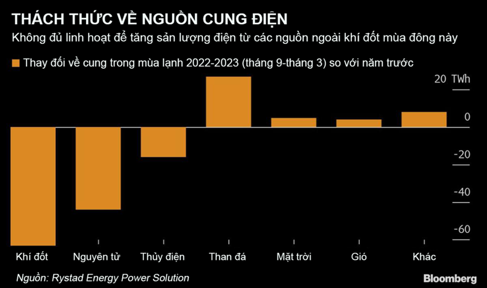 Thứ tư, những sự cố nằm ngoài dự kiến, như việc nhà máy LNG Freeport ở Mỹ xảy ra vụ nổ nghiêm trọng trong tháng 6 vừa qua sẽ càng làm trầm trọng thêm tình hình thiếu năng lượng của khu vực này. Cuối cùng, yếu tố thời tiết- cũng là yếu tố khó dự báo nhất, có thể đe dọa trạng thái cân bằng cung-cầu của năng lượng Châu Âu. Dự báo tháng 10 năm nay, nhiệt độ tại châu Âu sẽ ở mức cao hơn bình thường. Tuy nhiên, nếu châu Âu phải trải qua một mùa đông tương tự như năm 2012 – mùa đông lạnh nhất trong 10 năm qua, thì nhu cầu khí đốt của khu vực này sẽ là cao hơn khoảng 20 tỷ mét khối so với dự báo và tương đương 5% mức tiêu thụ của các năm bình thường. Điều này đồng nghĩa cân bằng cung-cầu khí đốt năm 2023 sẽ gặp thách thức lớn hơn nhiều.