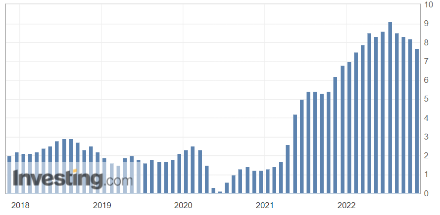 Theo dữ liệu mới nhất, chỉ số giá tiêu dùng (CPI) ở Mỹ trong tháng 10 tăng 7,7% so với cùng kỳ năm ngoái. Đây là lần đầu tiên mức tăng hằng năm của CPI xuống dưới 8% kể từ tháng 2-2022, qua đó phát đi tín hiệu mạnh mẽ rằng lạm phát đang tăng chậm lại ở Mỹ.