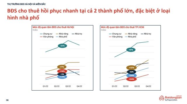 Báo cáo mới đây của Batdongsan.com.vn cho thấy, thị trường cho thuê bất động sản phục hồi mạnh so với đầu năm, song Hà Nội vẫn có tốc độ chậm hơn so với TP. HCM. Mức độ quan tâm tới bất động sản cho thuê tại Hà Nội tăng 63%, còn tại TP. HCM tăng 103% so với quý IV/2022. Cụ thể, tại Hà Nội, nhà phố cho thuê có mức độ quan tâm tăng 179%, văn phòng tăng 153%, nhà riêng tăng 77%, chung cư tăng 21%, còn nhà trọ giảm 10% so với hồi đầu năm. Tại TP. HCM mức độ quan tâm có sự tăng trưởng đột biến, đặc biệt ở phân khúc nhà phố tăng 263%, văn phòng 244%, nhà riêng tăng 157%, nhà trọ tăng 84%, chung cư tăng 57%.