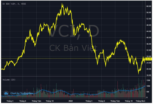 Về tình hình kinh doanh, quý 3 vừa qua, VCSC đạt doanh thu hoạt động hơn 561 tỷ đồng, giảm 31% so với cùng kỳ. Kết quả, Công ty báo lãi sau thuế giảm 63% so với cùng kỳ, xuống mức 123 tỷ đồng. Lũy kế 9 tháng đầu năm, tổng doanh thu hoạt động đạt 2.360 tỷ đồng, giảm 8% so với cùng kỳ. Lợi nhuận trước thuế đạt 1.027 tỷ đồng, tương ứng 54% chỉ tiêu lợi nhuận mục tiêu của cả năm. Lợi nhuận sau thuế đạt 840 tỷ đồng, giảm 19% so với số lãi cùng kỳ năm ngoái. Trên sàn chứng khoán, kết phiên 14/12, mã VCI đạt 26.350 đồng/cổ phiếu, giảm mạnh so với vùng đỉnh 60.990 đồng/cp hồi cuối năm trước.