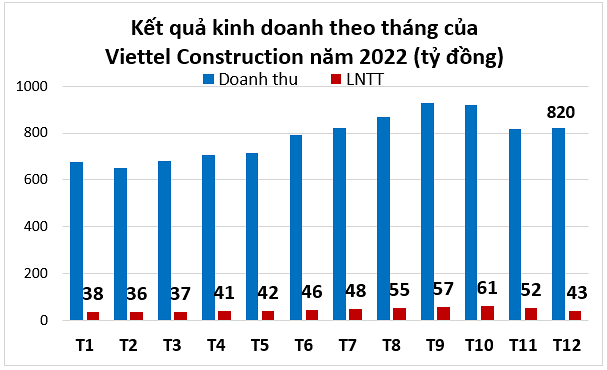 Như vậy trong quý IV, Viettel Construction ghi nhận doanh thu khoảng 2.568 tỷ, lãi trước thuế 156 tỷ đồng, lần lượt tăng 29% và giảm 3% so với quý IV/2021. Tính riêng tháng 12, doanh thu của Viettel Construction khoảng 820 tỷ đồng, lãi trước thuế 43 tỷ.