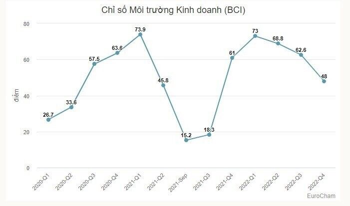 Sau 4 quý liên tiếp nằm ở vùng tích cực trên 50 điểm, chỉ số môi trường kinh doanh (BCI) quý IV/2022 do Hiệp hội Doanh nghiệp Châu Âu tại Việt Nam (EuroCham) vừa công bố ghi nhận mức giảm còn 48 điểm, tức đã lùi về vùng thu hẹp. “Quý IV cho thấy niềm tin vào môi trường kinh doanh đã có sự suy giảm khi các chỉ số biến động toàn cầu, lạm phát và tăng trưởng chậm lại, tác động đến tâm lý ở Việt Nam”, Giám đốc điều hành Decision Lap Thue Quist Thomasen, đối tác thực hiện khảo sát BCI của EuroCham nói. Ông Alain Cany, Chủ tịch EuroCham cho rằng môi trường sản xuất kinh doanh rất có thể tiếp tục sẽ theo hướng chậm lại vào năm 2023, nhưng điều này “không nên được coi là nguyên nhân gây lo ngại”.
