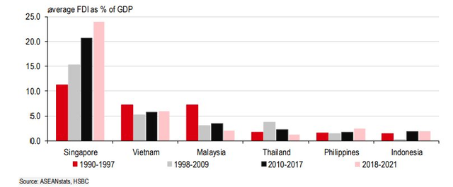 Bất chấp những khó khăn về thương mại trước mắt, triển vọng FDI tích cực tiếp tục mang lại cái nhìn lạc quan cho triển vọng thương mại của ASEAN. Trong 30 năm qua, ASEAN đã chứng kiến một lượng lớn FDI nhờ vào điều kiện nền tảng thuận lợi của khu vực, hiệu quả về chi phí ngày càng tăng và quá trình chuyển đổi cơ cấu đang diễn ra. Trong khi Khủng hoảng tài chính châu Á (AFC) có tác động tiêu cực đến môi trường FDI của ASEAN, tỷ trọng FDI chảy vào khu vực trên tổng dòng vốn đầu tư của thế giới đã tăng trong suốt một thập kỷ sau Khủng hoảng tài chính toàn cầu (GFC), đạt mức cao kỷ lục 11% vào năm 2021, gần như ngang bằng với Trung Quốc. Tuy nhiên, bức tranh FDI mỗi nước một khác, với tỷ trọng lớn nhất rơi vào Singapore, Việt Nam và Malaysia, những quốc gia có lĩnh vực sản xuất là trụ cột tăng trưởng chính. Thật vậy, sản xuất tiếp tục là “xương sống” của FDI vào ASEAN, một lĩnh vực mà Trung Quốc đã bắt kịp với các quốc gia châu Á khác trong những năm gần đây.