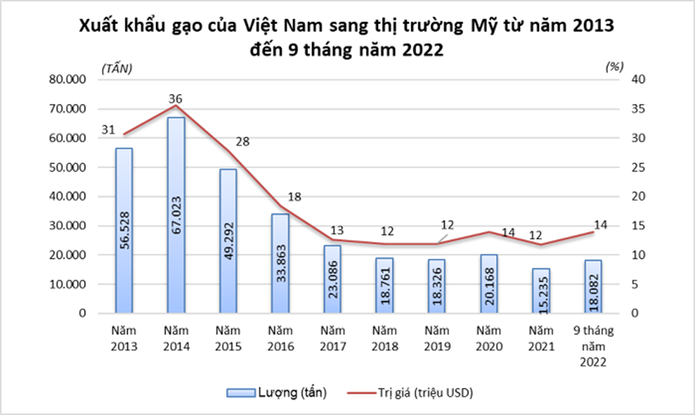 Theo số liệu của Ủy ban thương mại quốc tế Mỹ (USITC), tính đến hết tháng 8 năm nay, Mỹ đã nhập khẩu 906.569 tấn gạo, trị giá hơn 793 triệu USD, tăng 37,9% về lượng và tăng 32,7% về trị giá so với cùng kỳ năm ngoái. Bộ Nông nghiệp Mỹ (USDA) ước tính nhập khẩu gạo của Mỹ trong năm 2022 dự kiến đạt 1,3 triệu tấn, tăng gần 33% so với năm 2021. Con số này được dự báo sẽ tiếp tục tăng lên mức kỷ lục là 1,4 triệu tấn vào năm 2023, với phần lớn là gạo thơm, gạo đặc sản đến từ khu vực châu Á. Số liệu của Tổng cục Hải quan Việt Nam cũng cho thấy, Việt Nam đã xuất khẩu 18.082 tấn gạo sang thị trường Mỹ trong 9 tháng đầu năm nay với trị giá 13,9 triệu USD, so với cùng kỳ năm ngoái tăng 62,1% về lượng và tăng 67% về trị giá.