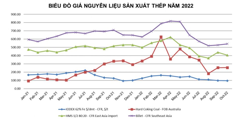 Theo Hiệp hội Thép Việt Nam (VSA), giá nhập khẩu một số nguyên liệu sản xuất thép như quặng sắt, than mỡ, coke, điện cực đã đi xuống trong vài tháng trở lại đây. Cụ thể, giá quặng sắt loại (62% Fe) ngày 6/10 giao dịch ở mức 95,45-95,95 USD/tấn CFR cảng Thiên Tân, Trung Quốc, giảm khoảng 2,3 USD/tấn so với thời điểm đầu tháng 9. Mức giá này giảm khoảng 114-116 USD/tấn so với mức giá cao nhất được ghi nhận hồi tháng 5/2021, tương đương 210 – 212 USD/tấn.