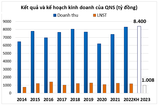 Ngày 19/12, Hội đồng quản trị (HĐQT) CTCP Đường Quảng Ngãi (Mã: QNS) đã công bố ước tính kết quả kinh doanh năm 2022 với doanh thu hợp nhất 8.300 tỷ đồng, tăng 12,5% so với năm ngoái và cao nhất từ trước đến nay. Lợi nhuận sau thuế 1.198 tỷ, giảm 4,3%. Sang năm 2023, QNS đặt mục tiêu doanh thu hợp nhất 8.400 tỷ đồng, lợi nhuận sau thuế 1.008 tỷ đồng; lần lượt tăng 1,2% và giảm 16% so với ước tính kết quả năm 2022.