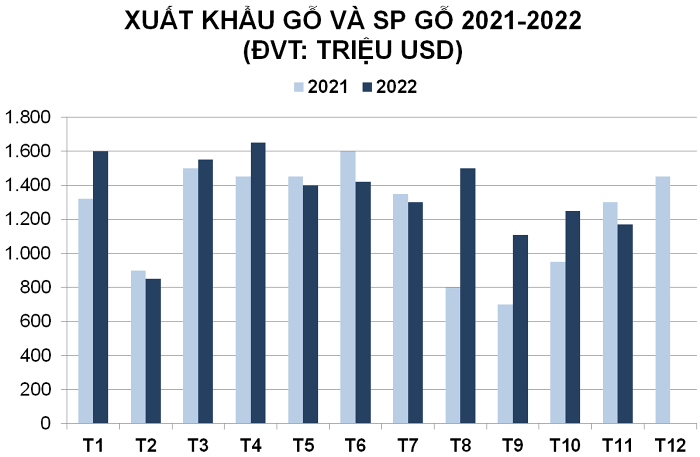 Trong tháng 11/2022, Cục Xuất nhập khẩu (Bộ Công Thương) dẫn số liệu thống kê từ Tổng cục Hải quan cho biết xuất khẩu gỗ và sản phẩm gỗ đạt 1,17 tỷ USD, giảm hơn 2% so với tháng 10 và giảm 8,8% so với tháng 11/2021.