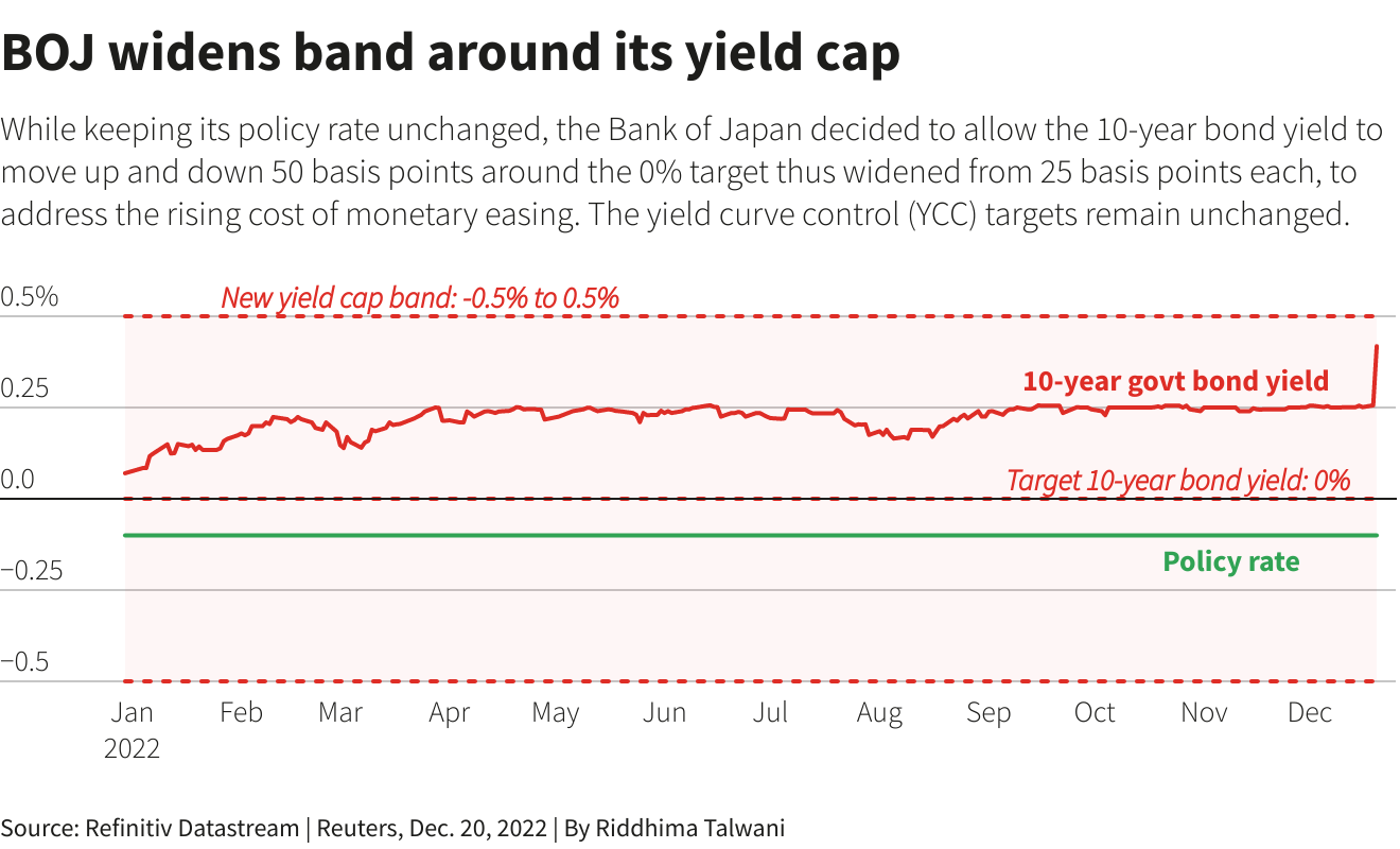 Sau thông báo của BOJ, giá trái phiếu chính phủ Nhật Bản và trái phiếu kho bạc Mỹ đều sụt giảm, trong khi đồng Yên tăng mạnh. Theo UBS Group AG, các nhà đầu tư dự kiến sẽ bán trái phiếu ở Mỹ, Úc, và Pháp, và cổ phiếu của các thị trường phát triển cũng có khả năng sụt giảm. Lợi suất trái phiếu kỳ hạn 10 năm của Pháp đã tăng 9 điểm cơ bản lên 2.81% trong ngày 20/12, cao nhất trong số các thị trường chính trong khu vực. Thị trường chứng khoán Đức đã giảm ngày thứ 5 liên tiếp và là chuỗi giảm giá dài nhất kể từ đầu tháng 9. Chỉ số Nikkei 225 Stock Average giảm tới 3%.