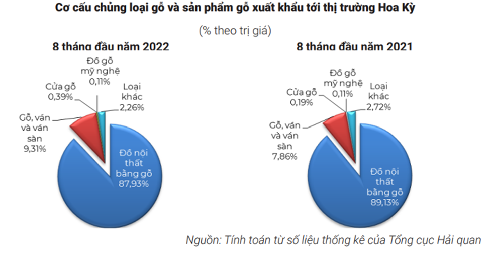 Trong 8 tháng đầu năm 2022, trị giá xuất khẩu đồ nội thất bằng gỗ của Việt Nam tới Mỹ đạt 5,5 tỷ USD, giảm 2,8% so với cùng kỳ năm 2021, tỷ trọng xuất khẩu chiếm 87,93% tổng trị giá xuất khẩu gỗ và sản phẩm gỗ tới thị trường Mỹ. Với trị giá chiếm tỷ trọng lớn, nên mức giảm của mặt hàng này sẽ làm giảm trị giá xuất khẩu chung của mặt hàng gỗ và sản phẩm gỗ tới Mỹ.