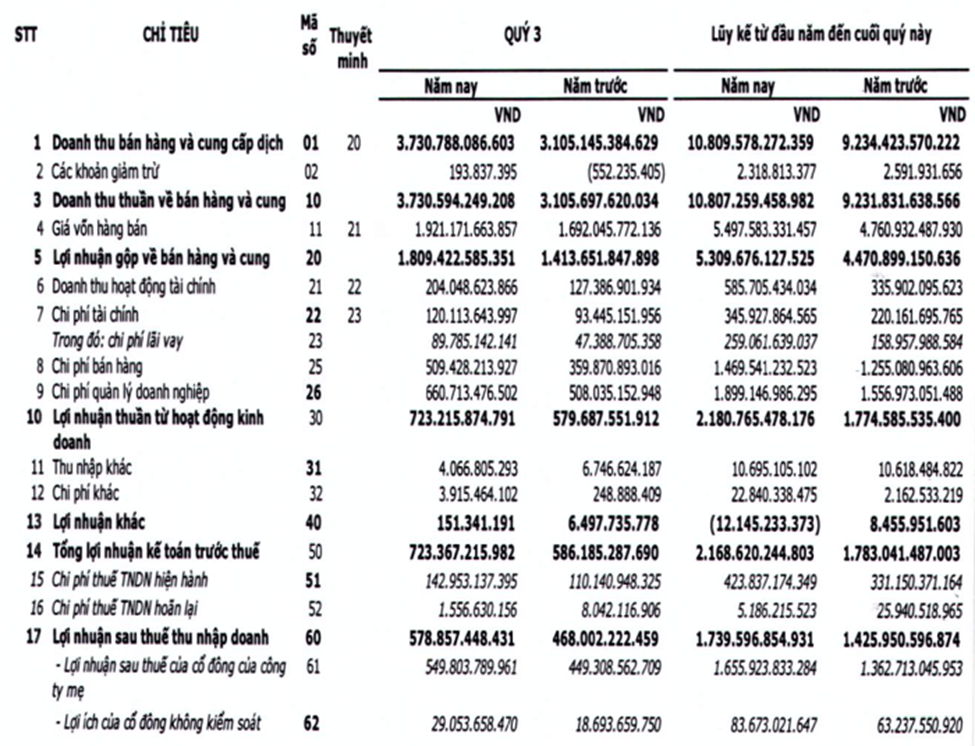 CTCP Viễn thông FPT (FPT Telecom – Mã: FOX) vừa công bố BCTC hợp nhất quý III/2022 với doanh thu thuần đạt gần 3.731 tỷ đồng, lợi nhuận sau thuế 579 tỷ đồng, tăng lần lượt 20% và 23,7% so với cùng kỳ năm ngoái.Biên lợi nhuận gộp đạt 48,5%, tăng 3 điểm % so với quý III/2021. Lũy kế 9 tháng, FPT Telecom đạt doanh thu thuần hơn 10.807 tỷ đồng và lợi nhuận sau thuế gần 1.740 tỷ đồng, lần lượt tăng 17% và 22% so với cùng thời gian năm 2021.