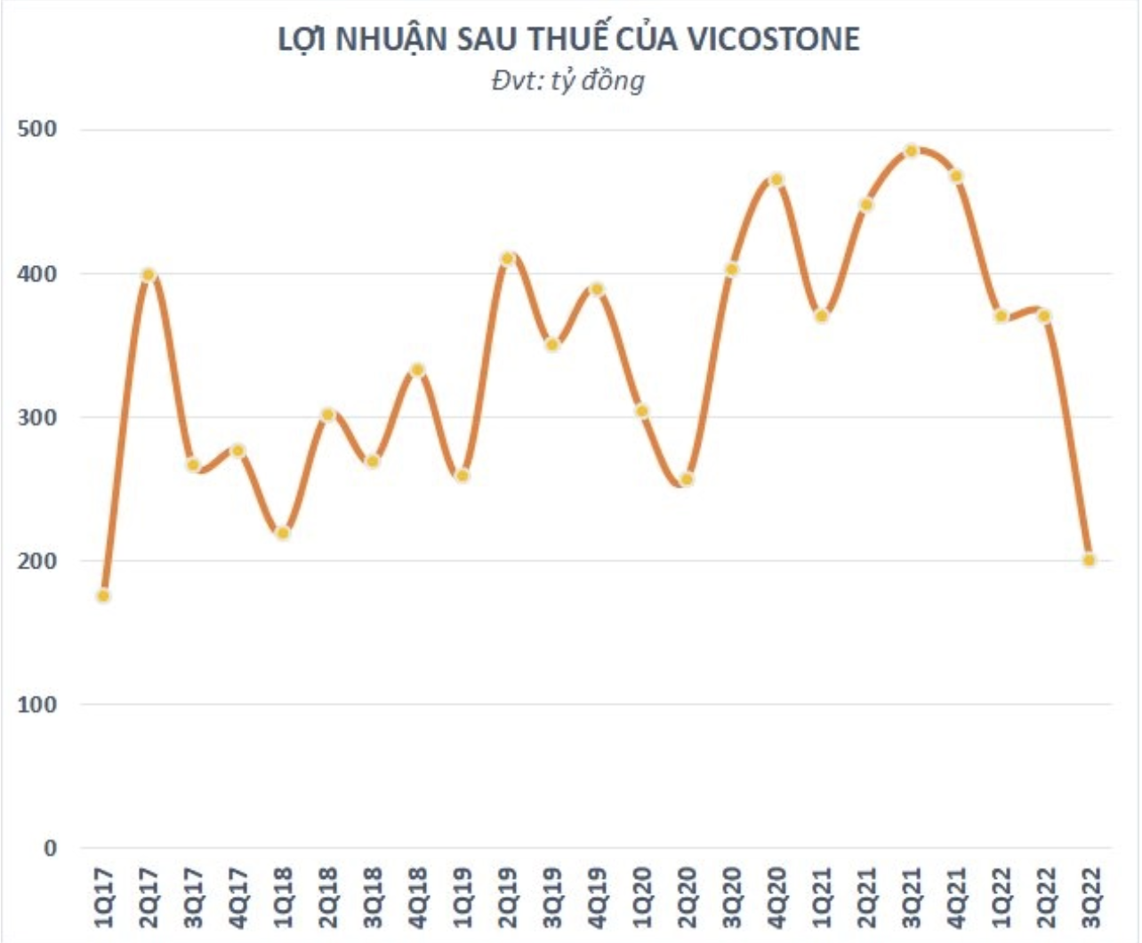 Về kết quả kinh doanh quý 3, Vicostone ghi nhận doanh thu đạt gần 1.100 tỷ đồng, giảm 41% so với cùng kỳ. Biên lãi gộp co lại từ 36,5% xuống còn 31,4% tương ứng lợi nhuận gộp giảm gần một nửa so với cùng kỳ xuống 344 tỷ đồng. Lãi ròng thu về 201 tỷ đồng, giảm 58,5% so với cùng kỳ và là mức thấp nhất kể từ quý 1/2017. Lũy kế 9 tháng, Vicostone ghi nhận doanh thu thuần đạt 4.433 tỷ đồng và lợi nhuận trước thuế đạt gần 1.119 tỷ đồng, lần lượt giảm 15% và 27% so với cùng kỳ. Lợi nhuận sau thuế giảm gần 28% so với cùng kỳ, đạt 942 tỷ đồng. Với kết quả đạt được, công ty mới thực hiện được 53% kế hoạch doanh thu và 46% mục tiêu lợi nhuận cả năm sau 3/4 chặng đường.