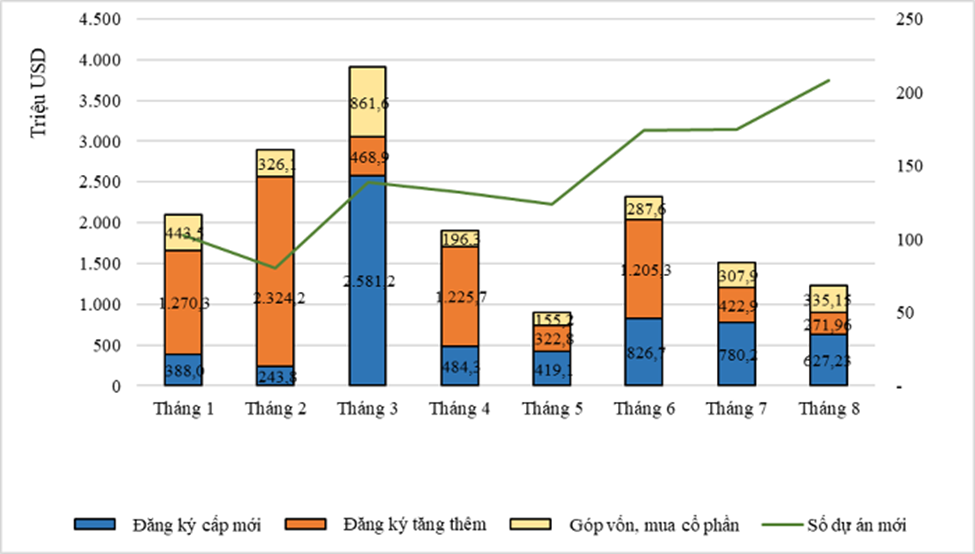 Theo báo cáo từ Bộ Kế hoạch và Đầu tư (KH&ĐT), tính đến ngày 20/8/2022, tổng vốn đăng ký cấp mới, điều chỉnh và góp vốn mua cổ phần, mua phần vốn góp (GVMCP) của nhà đầu tư nước ngoài đạt gần 16,8 tỷ USD, giảm 12,3% so với cùng kỳ năm 2021. Cụ thể, có 1.135 dự án mới được cấp Giấy chứng nhận đăng ký đầu tư với tổng vốn đăng ký đạt trên 6,35 tỷ USD, giảm 43,9% so với cùng kỳ năm ngoái.