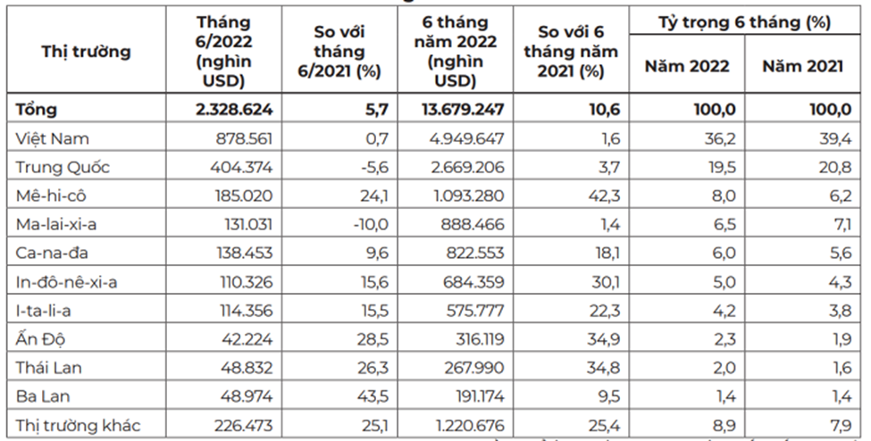 Trong đó, Việt Nam là thị trường cung cấp đồ nội thất bằng gỗ lớn nhất cho Mỹ, với trị giá chiếm 36,2% tổng trị giá nhập khẩu, giảm 3,2 điểm phần trăm so với cùng kỳ năm 2021. Tiếp theo là thị trường Trung Quốc chiếm 19,5%, giảm 1,3 điểm phần trăm.