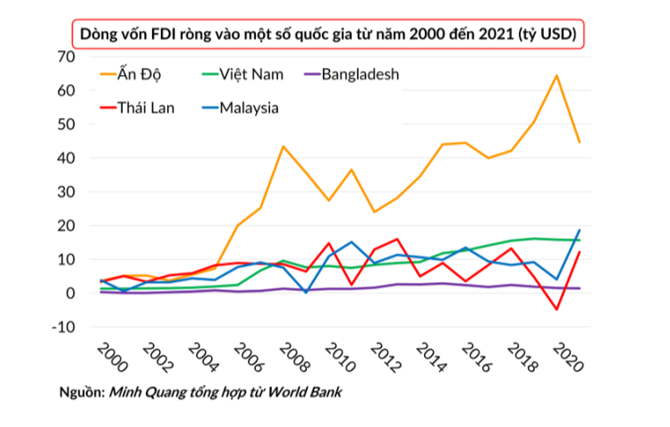 Còn ở Việt Nam, Ngân hàng Thế giới (World Bank) từng nhận định rằng cuộc cải cách kinh tế từ năm 1986 đã đưa Việt Nam từ “một trong những quốc gia nghèo nhất thế giới” trở thành “nền kinh tế có thu nhập trung bình trong một thế hệ”. Theo Bộ Kế hoạch và Đầu tư, vào năm 2021, Việt Nam đã thu hút hơn 31,15 tỷ USD cam kết vốn FDI, tăng 9% so với năm trước. Khoảng 60% vốn FDI đổ vào lĩnh vực sản xuất và chế biến. Thế mạnh chính của Việt Nam là sản xuất hàng may mặc, giày dép, điện tử và đồ gia dụng. Ngoài Ấn Độ, gã khổng lồ công nghệ Apple đã chuyển một số hoạt động sản xuất iPhone cũng như MacBook sang Việt Nam. Nike, Adidas và Samsung cũng đã chuyển một số dây chuyền sản xuất từ Trung Quốc sang Việt Nam.