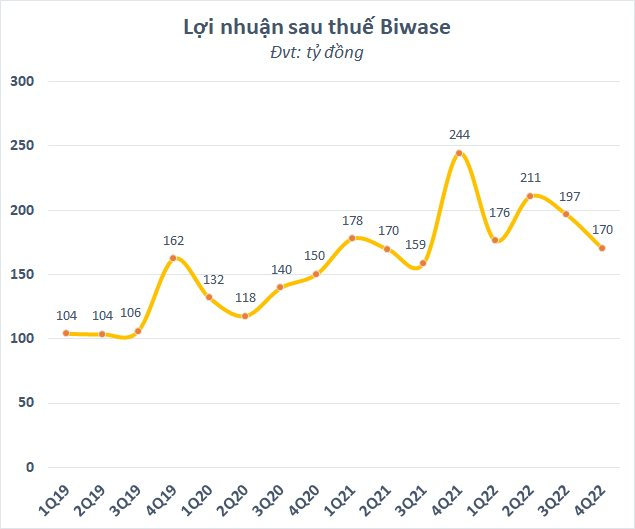 Trong kỳ, doanh thu tài chính giảm 35% xuống còn 22 tỷ đồng trong khi chi phí tài chính lại tăng gấp 7 lần lên 35 tỷ đồng. Sau khi trừ các chi phí hoạt động, Biwase lãi trước thuế 199 tỷ đồng, giảm 30% so với cùng kỳ. Lợi nhuận ròng thu về hơn 170 tỷ đồng, cũng giảm 30% so với kết quả quý 4/2021 và là mức thấp nhất trong vòng 5 quý.