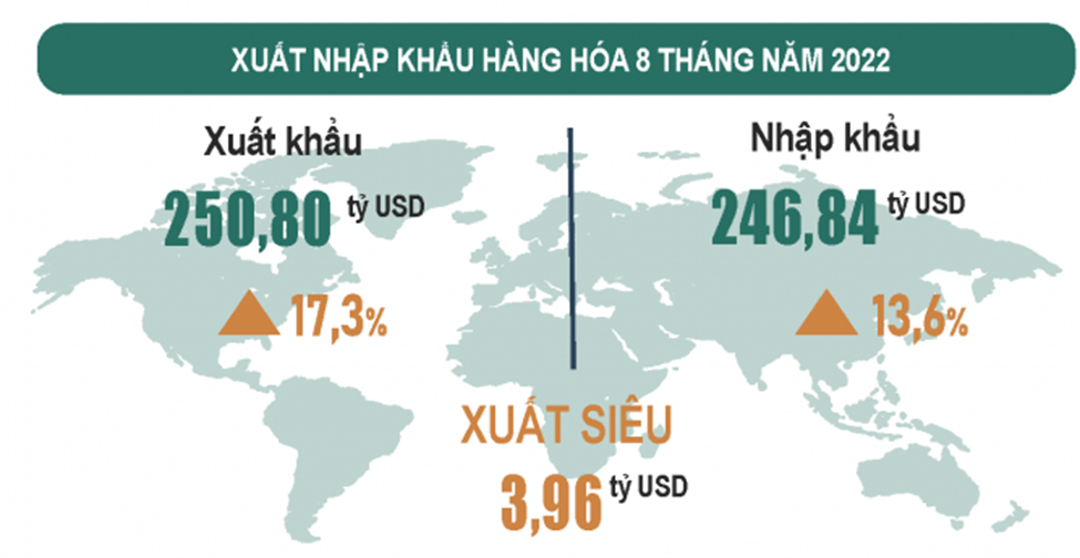 Đặc biệt, kim ngạch xuất khẩu hàng hóa tháng 8-2022 ước đạt 33.38 tỷ USD – tăng 9.1% so với tháng trước và tăng 22.1% so với cùng kỳ năm trước. Tính chung 8 tháng năm 2022, kim ngạch xuất khẩu hàng hóa ước đạt 250.8 tỷ USD – tăng 17.3% so với cùng kỳ năm trước. Tháng 8 ước tính xuất siêu 2.42 tỷ USD. Tính chung 8 tháng năm 2022, cán cân thương mại hàng hóa ước tính xuất siêu 3.96 tỷ USD (cùng kỳ năm trước nhập siêu 3.52 tỷ USD).