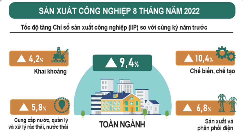 8 tháng đầu năm 2022, tình hình kinh tế- xã hội tiếp tục có nhiều điểm sáng trên nhiều lĩnh vực: sản xuất công nghiệp; thu hút đầu tư; xuất nhập khẩu; lượng khách quốc tế đến Việt Nam,… Cụ thể, theo thông tin từ Tổng cục Thống kê, Bộ Kế hoạch và Đầu tư, chỉ số sản xuất toàn ngành công nghiệp (IIP) tháng 8/2022 ước tăng 2.9% so với tháng trước và tăng 15.6% so với cùng kỳ năm trước. Trong đó, so với cùng kỳ năm trước, ngành chế biến, chế tạo tăng 16.2%. Tính chung 8 tháng năm 2022, IIP ước tăng 9.4% so với cùng kỳ năm trước (cùng kỳ năm 2021 tăng 5.5%).