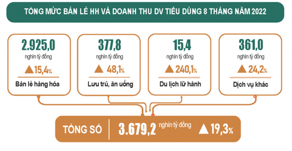 Đáng chú ý, tổng mức bán lẻ hàng hóa và doanh thu dịch vụ tiêu dùng tháng 8 ước đạt 481.2 nghìn tỷ đồng, tăng 0.6% so với tháng trước và tăng 50.2% so với cùng kỳ năm trước, đạt quy mô và tốc độ tăng cao hơn so với cùng kỳ các năm trước khi xảy ra dịch Covid-19. Tính chung 8 tháng năm 2022, tổng mức bán lẻ hàng hóa và doanh thu dịch vụ tiêu dùng ước đạt 3.679,2 nghìn tỷ đồng, tăng 19.3% so với cùng kỳ năm trước (cùng kỳ năm 2021 giảm 3.5%), nếu loại trừ yếu tố giá tăng 15.1% (cùng kỳ năm 2021 giảm 5.1%).