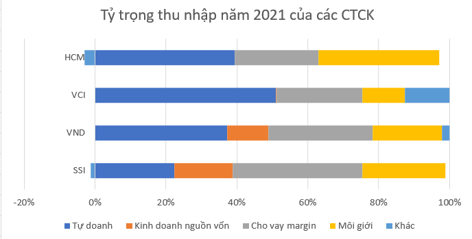 Thông thường, những CTCK top đầu với thu nhập từ môi giới và cho vay margin chiếm trên 35-40% trong tổng thu nhập được xem là an toàn. Vì 2 mảng này mang tính rủi ro thấp do CTCK chỉ đứng vai trò trung gian, đồng thời sẽ hưởng lợi lớn nhất khi yếu tố “lượng” (thanh khoản, số lượng NĐT tham gia thị trường,…) tăng lên.