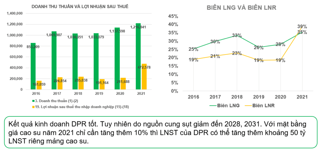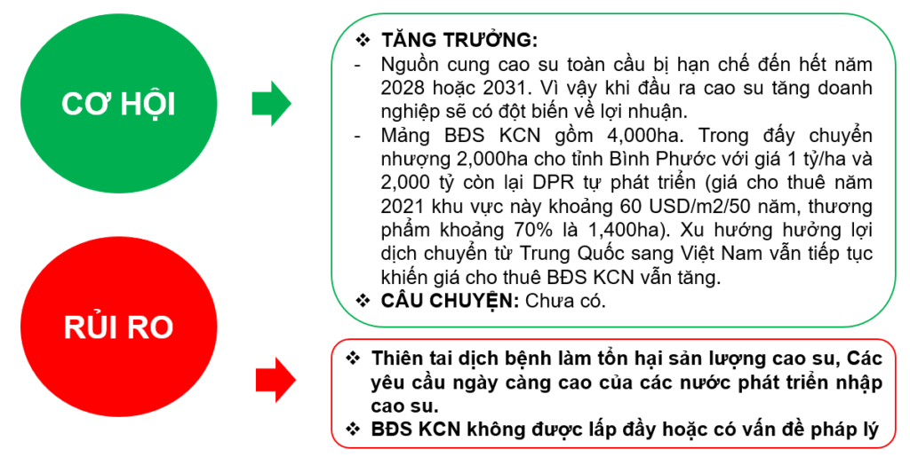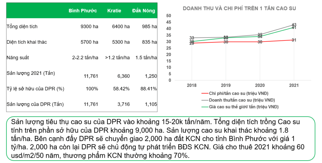 – Sản lượng tiêu thụ cao su của DPR vào khoảng 15-20k tấn/năm. Tổng diện tích trồng Cao su tính trên phần sở hữu của DPR khoảng 9,000 ha. Sản lượng cao su khai thác khoảng 1.8 tấn/ha. Bên cạnh đấy DPR sẽ chuyển giao 2,000 ha đất KCN cho tỉnh Bình Phước với giá 1 tỷ/ha. 2,000 ha còn lại DPR sẽ chủ động tự phát triển BĐS KCN. Giá cho thuê 2021 khoảng 60 usd/m2/50 năm, thương phẩm KCN thường khoảng 70% (1,400ha)