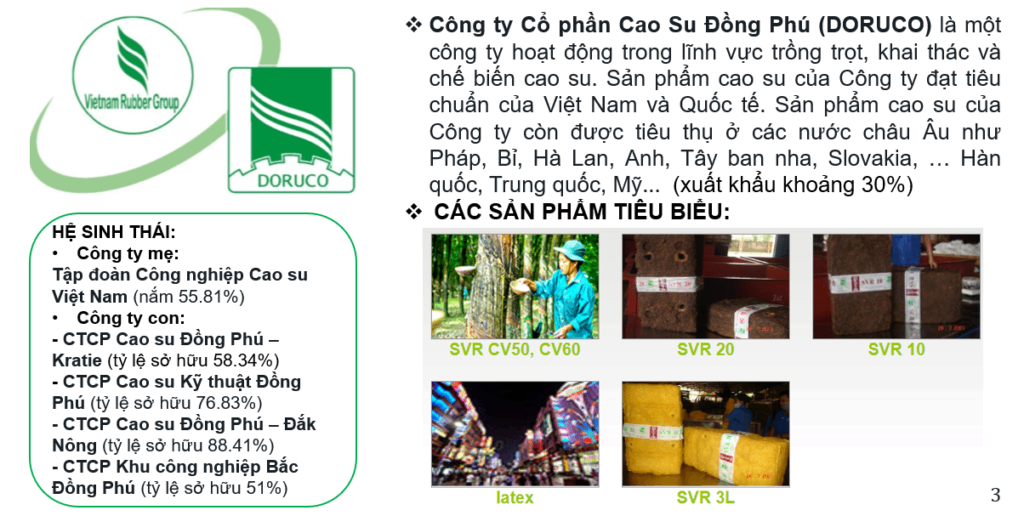 – Công ty Cổ phần Cao Su Đồng Phú (DORUCO) là một công ty hoạt động trong lĩnh vực trồng trọt, khai thác và chế biến cao su. Sản phẩm cao su của Công ty đạt tiêu chuẩn của Việt Nam và Quốc tế. Sản phẩm cao su của Công ty còn được tiêu thụ ở các nước châu Âu như Pháp, Bỉ, Hà Lan, Anh, Tây ban nha, Slovakia, … Hàn quốc, Trung quốc, Mỹ… (xuất khẩu khoảng 30%)