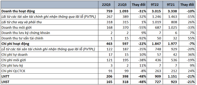 - Hoạt động môi giới giảm mạnh, cụ thể lợi nhuận môi giới sut giảm tới 51.3% do diễn biến vĩ mô bất ổn khiến niềm tin nhà đầu tư cẩn trọng, lượng giao dịch sụt giảm cùng với áp lực cạnh tranh phí môi giới các công ty chứng khoán cũng tác động thị phần bị sụt giảm