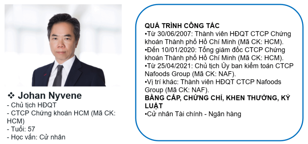 Ông Johan Nyvene được bầu là Chủ tịch Hội đồng Quản trị Công ty HSC từ tháng 04/2021. Ông có hơn 13 năm gắn bó với HSC trong cương vị là Tổng Giám đốc và là thành viên HĐQT tham điều hành từ 2007 đến tháng 03/2020. Trong suốt thời gian này, ông đã thực hiện nhiều đổi mới, đóng góp vào sự tăng trưởng và phát triển bền vững cho HSC. Dưới sự lãnh đạo của ông, HSC đã phát triển lớn mạnh, trở thành một trong những công ty chứng khoán lớn nhất Việt Nam. Trước đó, ông từng là người thành lập và điều hành Bộ phận Dịch vụ Chứng khoán của Ngân hàng HSBC Việt Nam. Ông đã trải qua 9 năm đầu trong sự nghiệp tài chính của mình với các vị trí chuyên viên phân tích và chuyên viên ngân hàng, phụ trách các thị trường Đông Nam Á tại Ngân hàng CoreStates First Union, Mỹ.