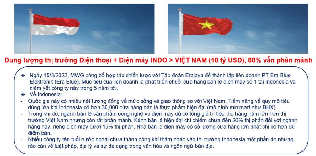 – MWG cũng có kế hoạch mở rộng thị trường điện thoại + điện máy ra Indonesia.