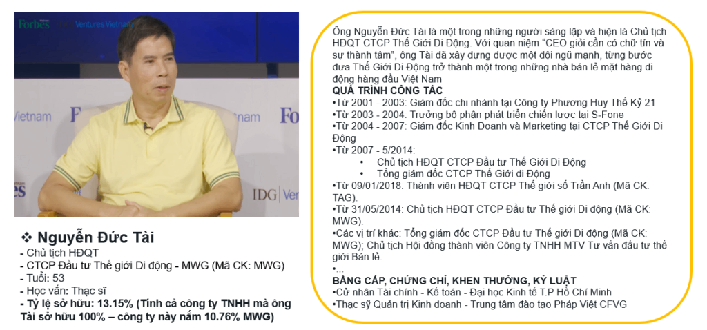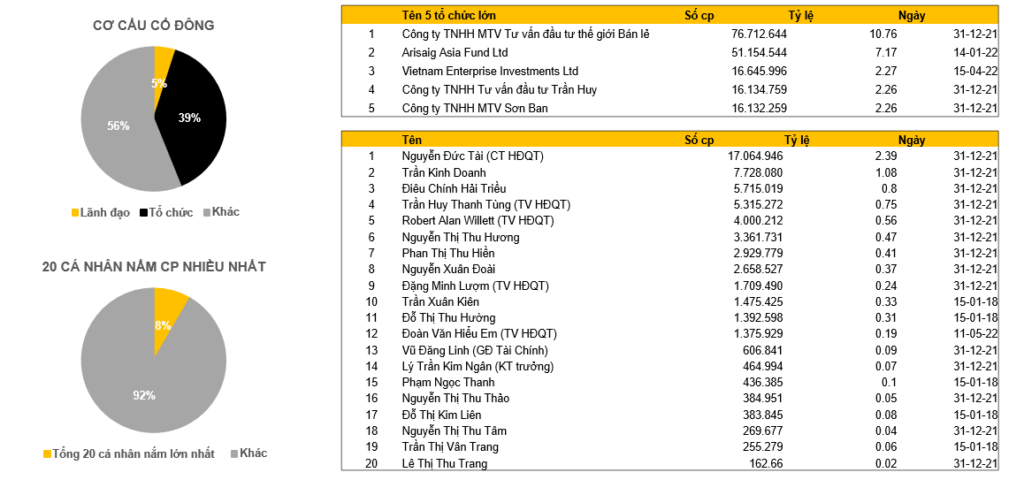 Cơ cấu cổ đông: MWG đã kín 49% room ngoại, bên cạnh đấy các tổ chức nắm đến 39% cơ cấu cổ đông (gồm cả các NĐT tổ chức ngoại và các công ty của đội ngũ lãnh đạo). 20 cá nhân nắm cổ phiếu nhiều nhất chiếm 8%, riêng chủ tịch Đức Tài nắm hơn 13%. Có thể nói đội ngũ lãnh đạo MWG nắm chéo tổng có thể lên đến 20% doanh nghiệp.