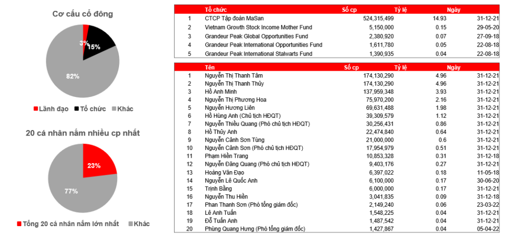 Cơ cấu cổ đông: Tập trung nhưng vẫn đủ đa dạng khi 20 cá nhân nắm nhiều cổ phiếu nhất chiến 23%, bên cạnh đấy các tổ chức nắm hơn 15% – đặc biệt chủ yếu là Tập đoàn MaSan mà ông Hồ Hùng Anh (Chủ tịch HĐQT) cũng là cổ đông lớn.