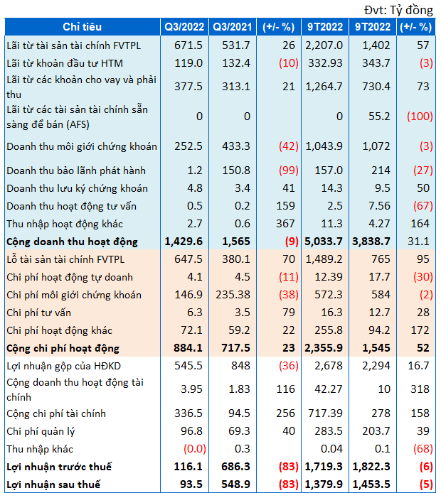 - Mảng tự doanh của Công ty cũng kém hơn so với quý 3 năm trước. Mặc dù vậy nhờ khoản đầu tư vào PTI đầy khả quan khiến mảng tự doanh 9 tháng đầu năm 2022 tăng 41%