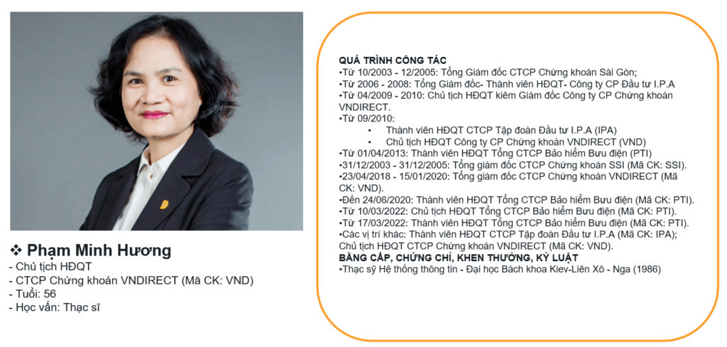 Dưới sự lãnh đạo của Bà, VNDIRECT thực sự đã được thử thách qua nhiều những thăng trầm kinh doanh của một thị trường non trẻ như Việt Nam. Bà cũng là một nhà lãnh đạo có tầm nhìn xa và là người tiên phong trong việc đưa sản phẩm mới tới thị trường. Sự đóng góp của Bà với cộng đồng chứng khoán có sức ảnh hưởng rất lớn và uy tín hoạt động cá nhân đã giúp cho Bà luôn là một nhà lãnh đạo có uy tín lớn trên thị trường tài chính Việt Nam.