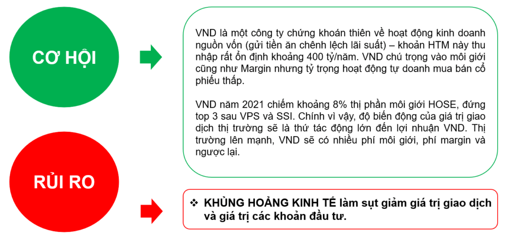 Luỹ kế 9 tháng đầu năm 2022, doanh thu hoạt động của VND đạt 5,033 tỷ đồng, tăng 31% yoy. Tuỳ nhiên lợi nhuận sau thuế giảm 5% còn 1,379.9 tỷ đồng. Nguyên nhân chủ yếu đến từ: